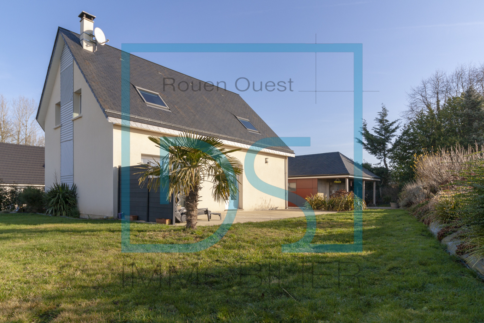 Le jardin paysagé de 1005 m² entièrement clôturé dispose d’un portail en aluminium automatisé, d’un garage en dépendance de 31 m² avec un bûcher et un abris.