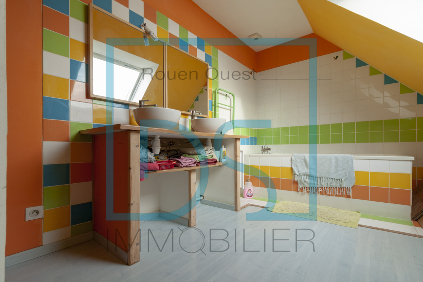 - 1 salle de bain avec baignoire, double vasque et wc